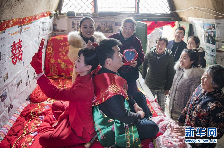 12月18日,在志丹縣金丁鎮(zhèn)謝灣村舉行的一場陜北婚俗表演中,鄉(xiāng)親們?yōu)椤靶氯恕笔崂?。這是婚俗中的“并頭”環(huán)節(jié)。