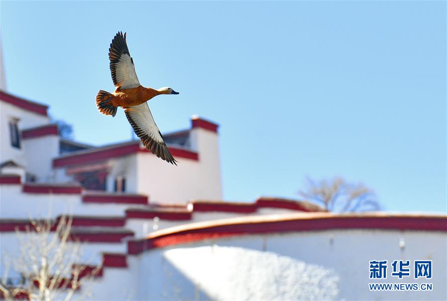 一只赤麻鴨從布達(dá)拉宮旁飛過(guò)(12月20日攝)。新華社記者張汝鋒攝