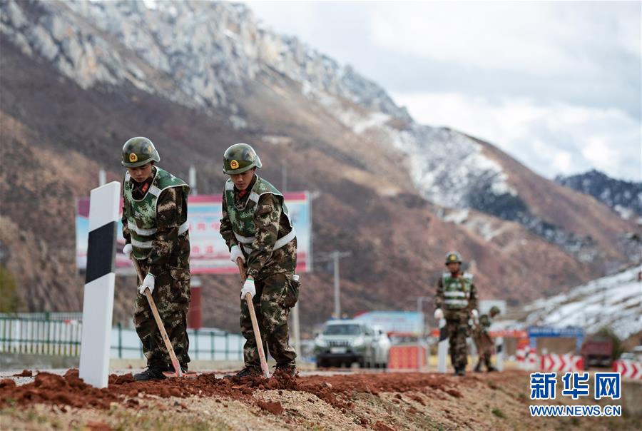 武警某部交通養(yǎng)護中隊的戰(zhàn)士在318國道八宿縣邦達鎮(zhèn)段養(yǎng)護路面(10月23日攝)。新華社記者江宏景攝