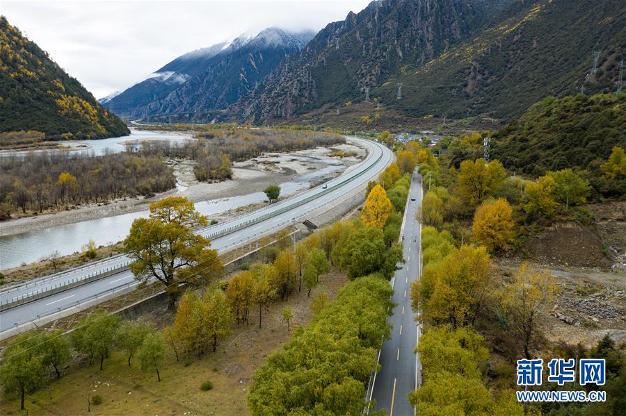 這是318國道西藏林芝市尼洋河谷段(10月27日無人機拍攝)。新華社記者江宏景攝