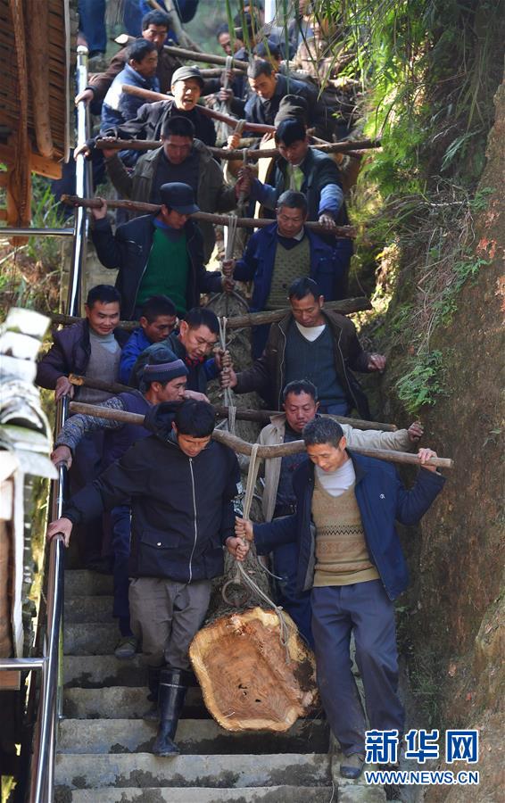 烏英苗寨村民合力抬木頭下山,準備制作蘆笙柱(12月2日攝)。新華社記者黃孝邦攝