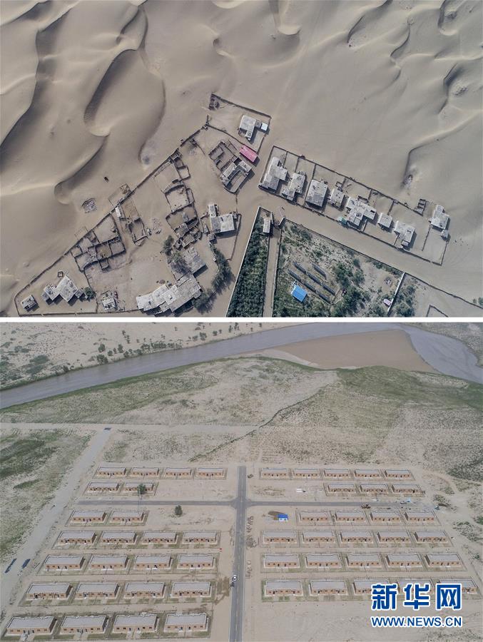 拼版照片:上圖為地處沙漠腹地的新疆于田縣達里雅布依鄉(xiāng)一處村落(2018年9月6日無人機拍攝);下圖為建設中的達里雅布依小鎮(zhèn)易地扶貧安置點(2018年9月8日無人機拍攝)。新華社記者胡虎虎攝