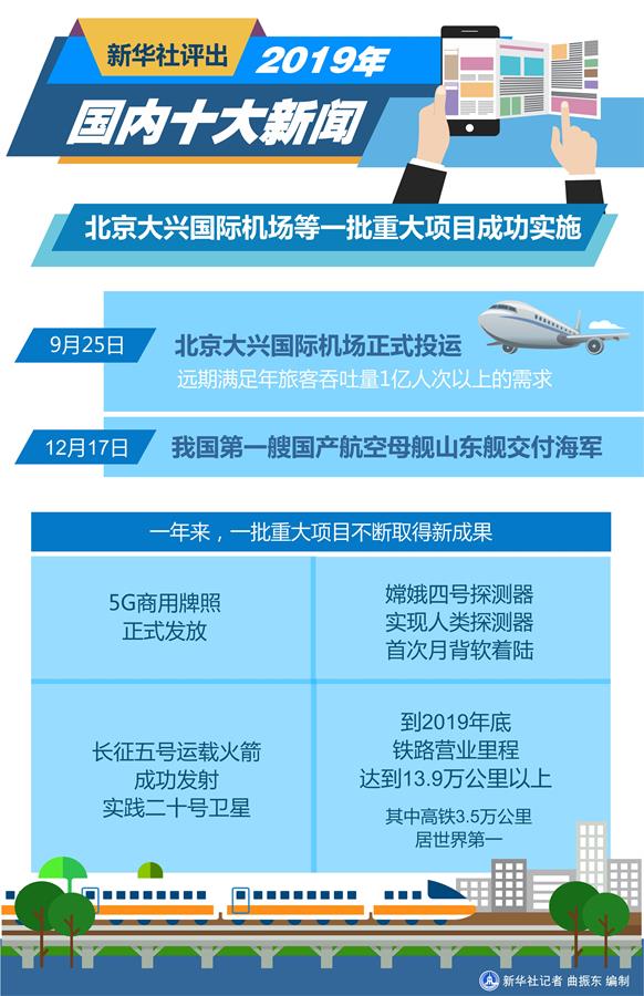 9月25日,北京大興國際機(jī)場正式投運(yùn),遠(yuǎn)期滿足年旅客吞吐量1億人次以上的需求。12月17日,我國第一艘國產(chǎn)航空母艦山東艦交付海軍。一年來,一批重大項(xiàng)目不斷取得新成果:5G商用牌照正式發(fā)放;嫦娥四號探測器實(shí)現(xiàn)人類探測器首次月背軟著陸;長征五號運(yùn)載火箭成功發(fā)射實(shí)踐二十號衛(wèi)星;到今年底,鐵路營業(yè)里程達(dá)到13.9萬公里以上,其中高鐵3.5萬公里,居世界第一。
