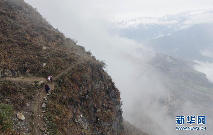 阿布洛哈村村民阿達(dá)色貴牽著馬馱運物資到村子里(2016年12月1日攝)。