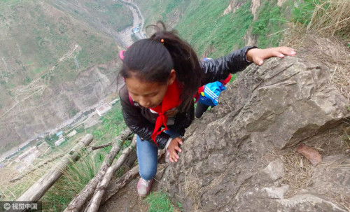 村里通向外界,需要順著懸崖斷續(xù)攀爬17條藤梯,其中接近村莊的幾乎垂直的兩條相連的藤梯長(zhǎng)度約100米,沒(méi)有藤梯的崖壁才是最危險(xiǎn)的。據(jù)支爾莫鄉(xiāng)黨委書(shū)記阿皮幾體講,他知道的在這條路上摔死的人有七八個(gè),有村里的人,也有外來(lái)的人,而摔傷的人更多。圖片來(lái)源:視覺(jué)中國(guó)