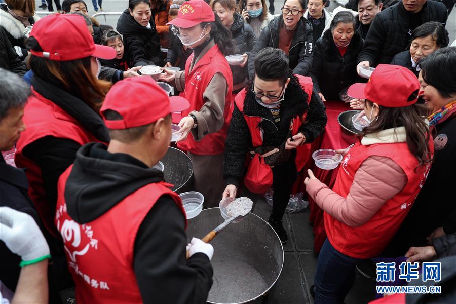1月2日,志愿者在閬中古城貢院廣場給大家發(fā)放臘八粥。 當(dāng)日是農(nóng)歷臘月初八臘八節(jié),四川閬中古城舉行“萬人同品臘八粥”活動,當(dāng)?shù)鼐用窈捅姸嘤慰驮谪曉簭V場免費(fèi)享用臘八粥。 新華社記者 江宏景 攝