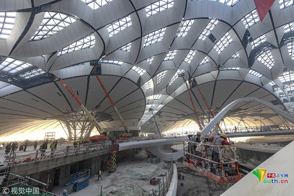 2018年12月19日,北京大興國(guó)際機(jī)場(chǎng)航站樓的室內(nèi)裝修在有條不紊的推進(jìn)中。視覺(jué)中國(guó)