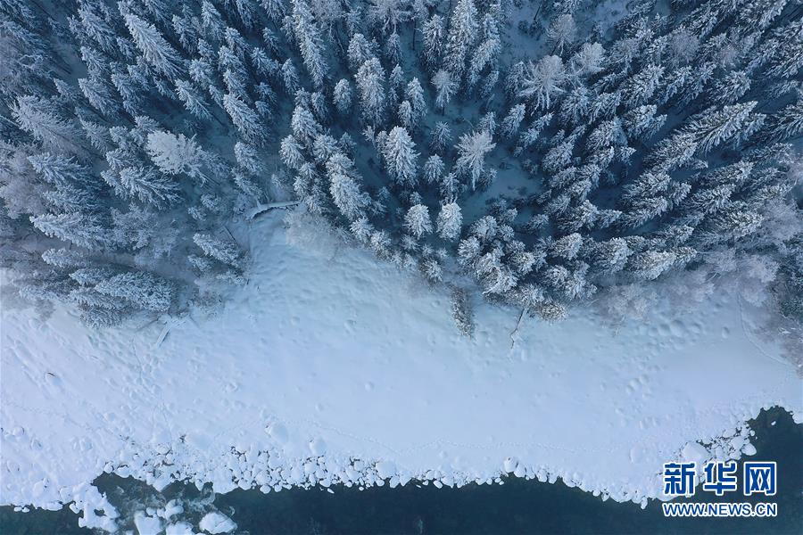 這是1月3日拍攝的喀納斯河畔的霧凇景觀(無人機(jī)照片)。新華社記者宋彥樺攝