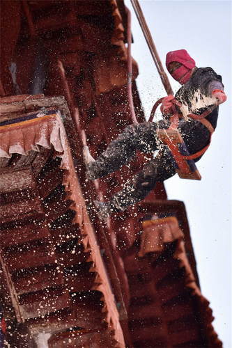 2019年11月1日,在西藏拉薩市布達(dá)拉宮,施工人員給墻體噴灑涂料。當(dāng)日,布達(dá)拉宮每年一度的墻體粉刷工程正式啟動,這也是布達(dá)拉宮例行的“年度美容”。新華社記者覺果攝