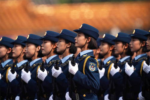 2019年10月1日,慶祝中華人民共和國(guó)成立70周年大會(huì)在北京天安門廣場(chǎng)隆重舉行。這是女兵方隊(duì)接受檢閱。新華社記者王毓國(guó)攝