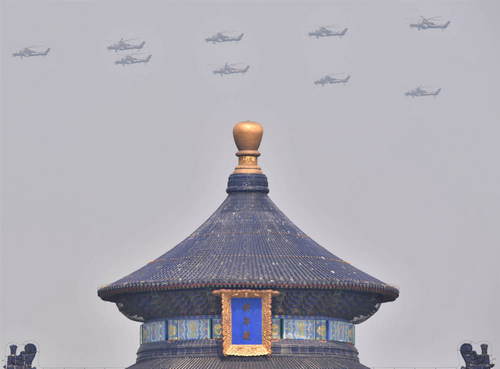 2019年10月1日,慶祝中華人民共和國成立70周年大會在北京天安門廣場隆重舉行。這是從天壇公園拍攝的陸航突擊梯隊。新華社記者賀長山攝