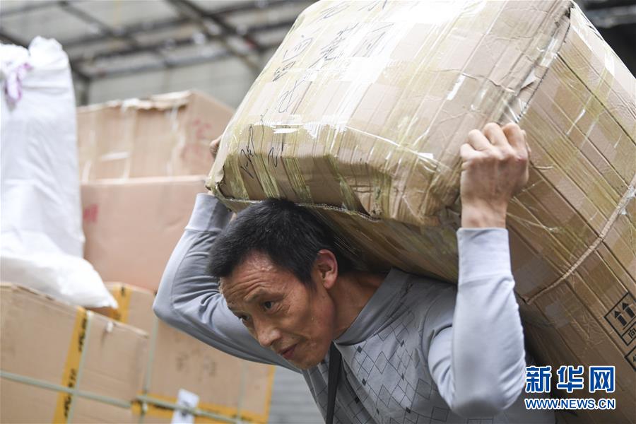 冉光輝在重慶朝天門大正商場(chǎng)內(nèi)搬運(yùn)貨物(1月5日攝)。新華社記者王全超攝