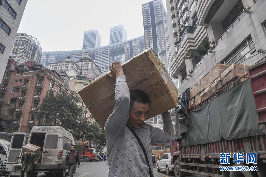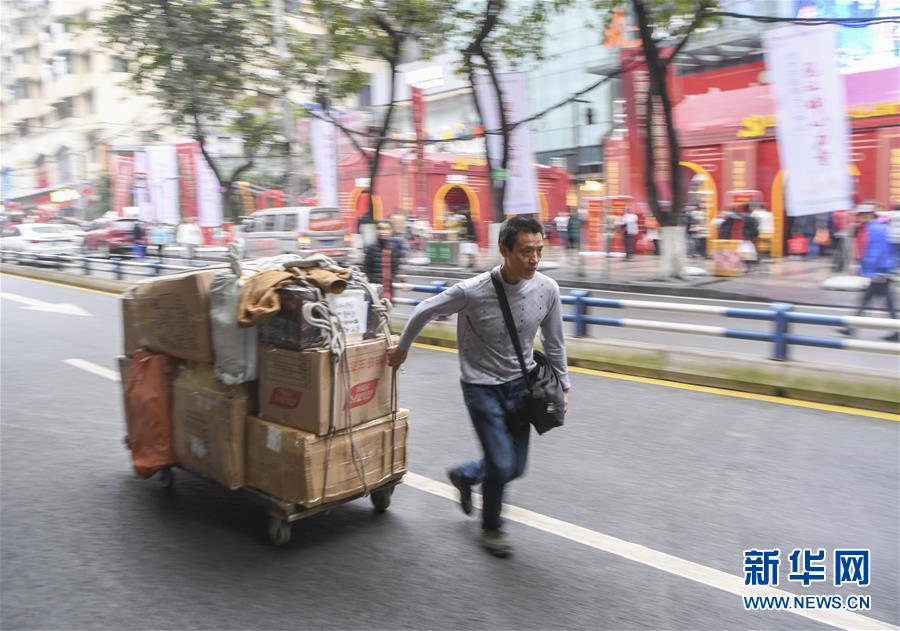 冉光輝用小板車載著貨物,從重慶朝天門大生商場(chǎng)出發(fā),前往發(fā)貨地點(diǎn)(1月5日攝)。新華社記者王全超攝