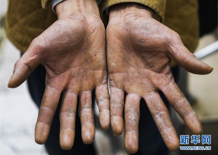 冉光輝展示自己的雙手(1月5日攝)。由于長(zhǎng)期搬運(yùn)重物,他的手磨出了不少老繭,指關(guān)節(jié)也有點(diǎn)變形。新華社記者王全超攝