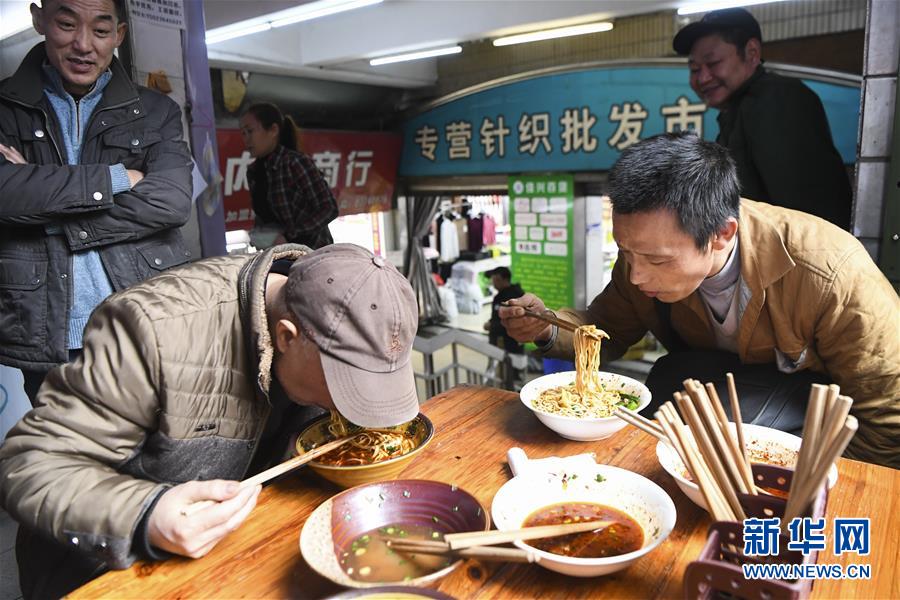 冉光輝(前右)在重慶朝天門(mén)大正商場(chǎng)附近吃小面,這是他的午餐(1月5日攝)。新華社記者王全超攝