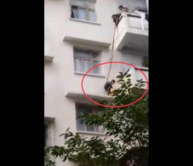 小男孩被大人們用繩子系著腰,晃晃悠悠地吊下三樓遮雨平臺(tái)后,勇敢地走向貓,將其抱起,接著又被5樓的奶奶等人晃晃悠悠地吊起往上拉,小男孩全程表情木然,絲毫未見緊張害怕。萬(wàn)幸的是,最終男孩平安并順利完成任務(wù)。