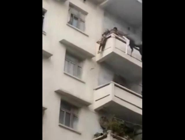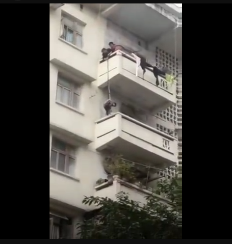 一只貓跑到了百順街老百貨公司宿舍樓三樓的窗戶遮雨臺(tái)上,被5樓的老太太發(fā)現(xiàn),老太太善心發(fā)作,竟將孫子用繩子吊起,從5樓慢慢放至3樓救貓,整個(gè)過(guò)程不禁令人捏汗。