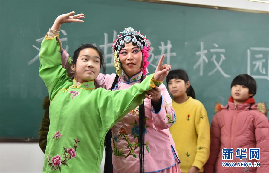 1月7日,定州市興定秧歌劇團(tuán)演員在明月店鎮(zhèn)吳咬村小學(xué)指導(dǎo)學(xué)生練習(xí)戲曲表演基本功。 新華社記者 朱旭東 攝