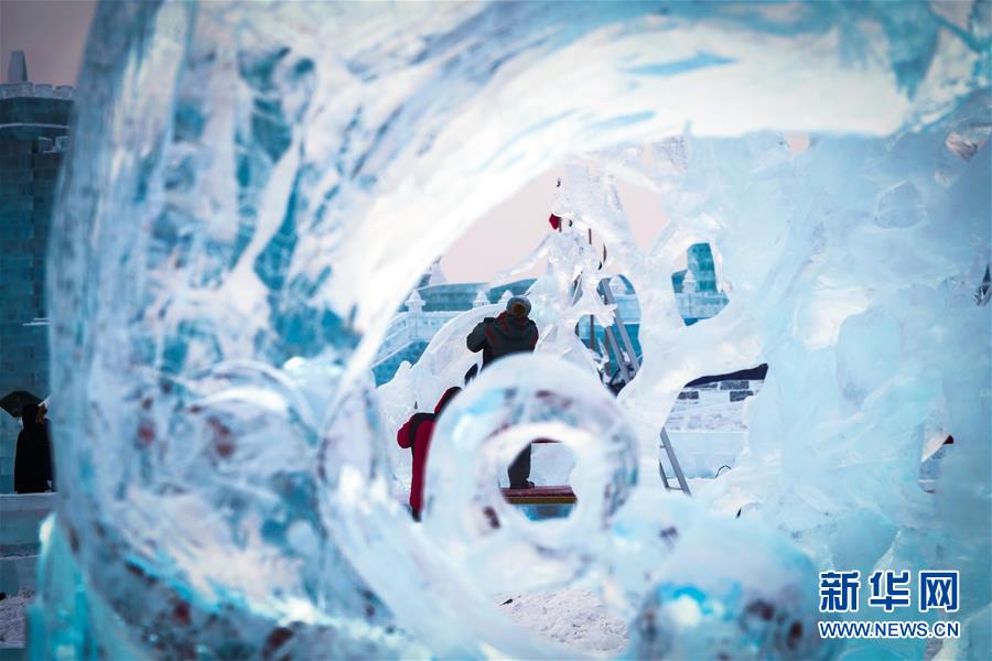 冰雕師在哈爾濱冰雪大世界內(nèi)雕刻冰雕作品(1月8日攝)。新華社記者王松攝