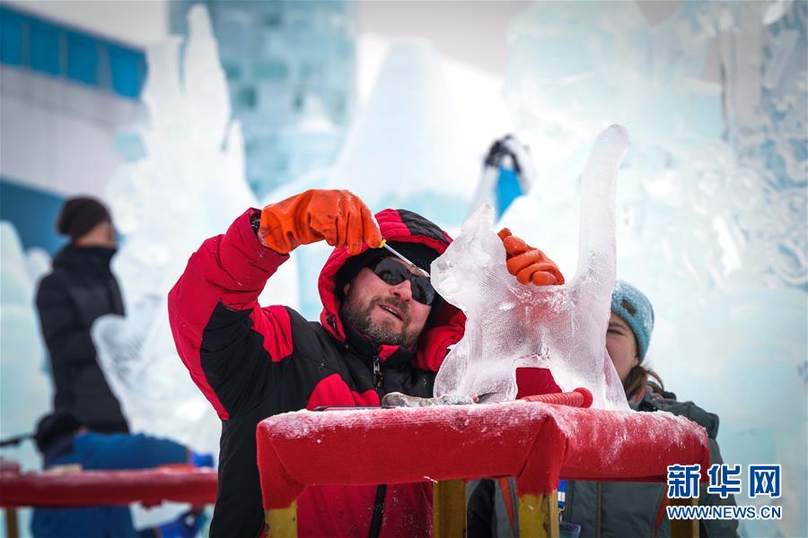 第九屆中國·哈爾濱國際組合冰雕比賽選手在哈爾濱冰雪大世界內(nèi)制作冰雕(1月2日攝)。新華社記者王松攝