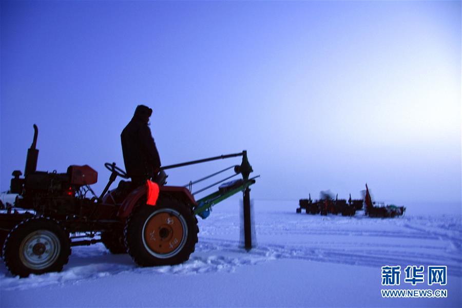 新疆福??h漁民使用冰鉆在冰面打眼(1月5日攝)。新華社記者張曉龍攝