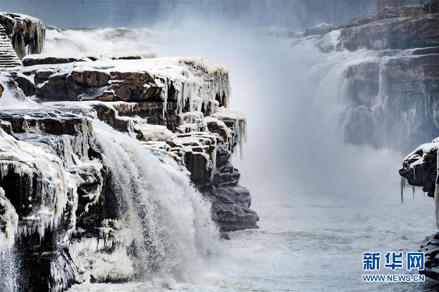 1月12日,黃河壺口瀑布景區(qū)內(nèi)的冰瀑與流動的瀑布形成一幅獨特的景觀。新華社記者陶明攝