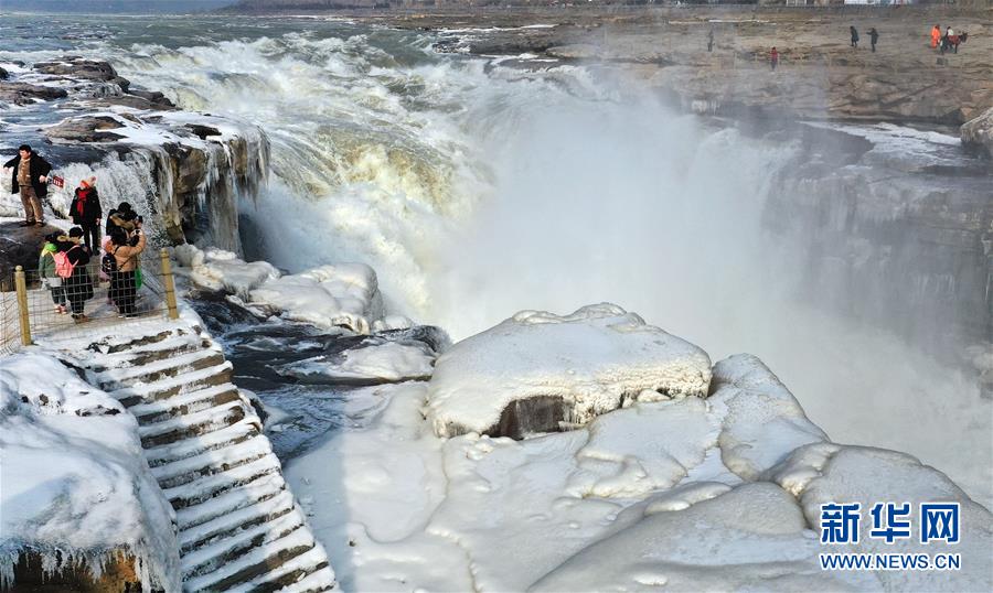 1月12日,游人在陜西黃河壺口瀑布景區(qū)游覽(無(wú)人機(jī)照片)。新華社記者陶明攝