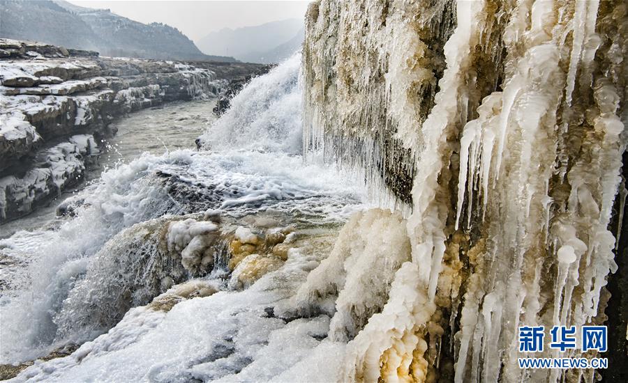 1月12日,陜西黃河壺口瀑布景區(qū)內(nèi)的冰瀑與流動(dòng)的瀑布形成一幅壯麗的圖畫。新華社記者陶明攝