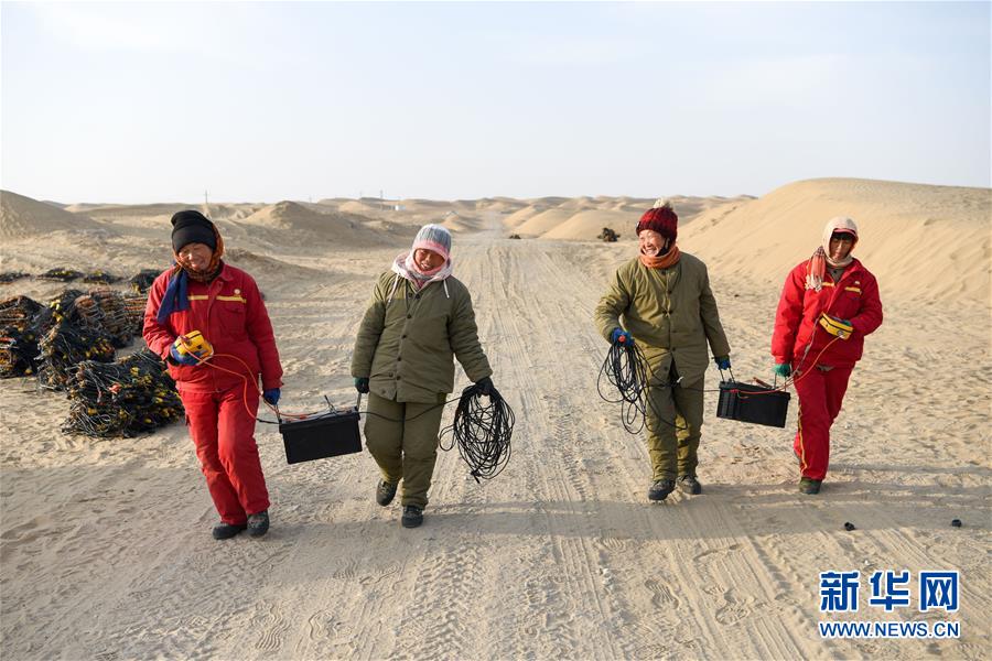 1月14日,4名測線女工抬著電瓶返回營地。地球物理勘探是油氣開發(fā)的第一步,相當于給地球做CT。物探工人按照嚴格的測線部署,在相應位置鉆井,然后實施地震,采集地震波數(shù)據(jù)。科研人員通過數(shù)據(jù)組成的“CT片”,就能夠清晰地“看”到地下的地質結構,判斷哪里埋藏有石油或者天然氣。2019年10月,東方地球物理勘探有限責任公司塔里木物探處2113隊進入新疆塔克拉瑪干沙漠腹地,開始中古14-21、塔中2兩個區(qū)塊的三維地震勘探。近2000名物探工人將在1000平方公里的范圍內(nèi)一直工作到2020年4月,這也意味著他們將在塔克拉瑪干沙漠腹地連續(xù)度過第14個除夕夜。蘊藏著豐富石油天然氣資源的新疆塔克拉瑪干沙漠有“死亡之海”之稱,氣候干燥,年降水量在50毫米以下,冬季地表最低溫度超過零下30攝氏度,是世界油氣勘探難度最大的地區(qū)之一。為避開風季,物探工人每年9、10月份進入沙漠,一直工作到來年4月,夜以繼日與黃沙、嚴寒為伴,用辛勤的汗水,為祖國找油找氣。新華社記者丁磊攝
