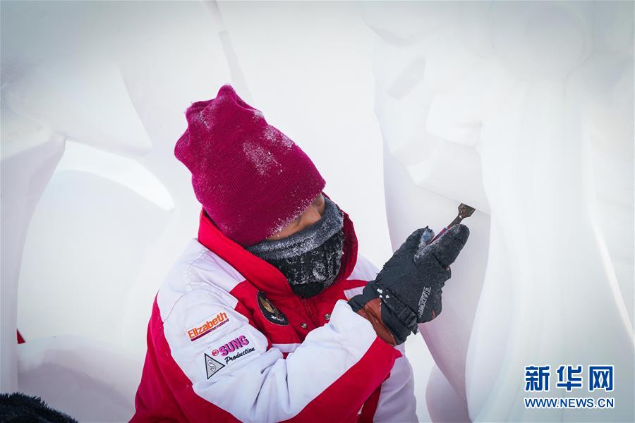 當(dāng)日,“冰城”哈爾濱氣溫低至零下20攝氏度左右,正在參加第二十五屆哈爾濱國際雪雕比賽的選手們冒著嚴(yán)寒進(jìn)行創(chuàng)作。