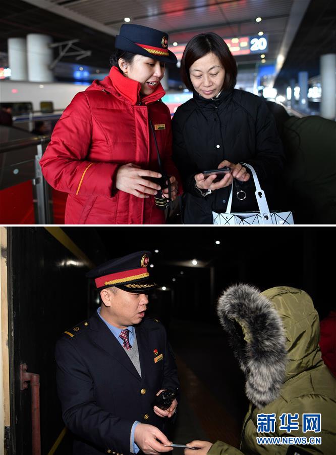 拼版照片上圖:在西安北站,列車(chē)長(zhǎng)陳海燕(左)幫助旅客在手機(jī)上購(gòu)買(mǎi)火車(chē)票(新華社記者詹彥1月11日攝);下圖:在陽(yáng)泉北站,列車(chē)長(zhǎng)趙耀(左)為旅客檢票(新華社記者楊晨光1月11日攝)。新華社發(fā)