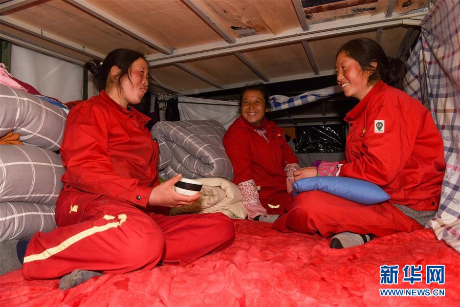 來(lái)自青海的放線工尚國(guó)青(中)三姐妹晚上在宿舍休息聊天(1月15日攝)。 新華社記者 丁磊 攝