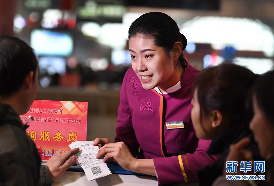 吉如在西安北站咨詢服務(wù)臺解答旅客的問題(1月15日攝)。 新華社記者 陶明 攝