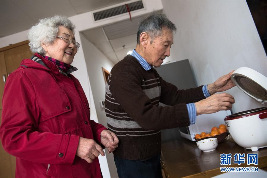 1月17日,王育華(左)回到宿舍,丈夫李偉光為她加熱從食堂打回的飯菜。新華社記者 翁忻旸 攝