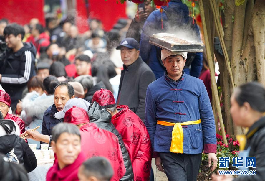 1月18日,在中山古鎮(zhèn)的“千米長宴”上,民間藝人用古鎮(zhèn)傳統(tǒng)“打盆”絕藝給游客們上菜。當(dāng)日中午,伴隨著一聲“開席嘍”,一年一度的“千米長宴”在重慶市江津區(qū)中山古鎮(zhèn)舉行。噴香的煙熏豆腐、軟糯的夾燒肉、可口的石板糍粑……800余桌年味十足的特色美食,吸引了兩萬多名游客前來體驗傳統(tǒng)民俗,感受“一雙筷子吃遍一條街”的暢快淋漓。中山古鎮(zhèn)自古就有“千米匯長宴萬人祈福祉”的習(xí)俗。每年春節(jié)期間,古鎮(zhèn)老街居民都會在千米長街上大擺“百家宴”,祝福生意興隆、家業(yè)興旺、風(fēng)調(diào)雨順、五谷豐登。新華社記者劉潺攝