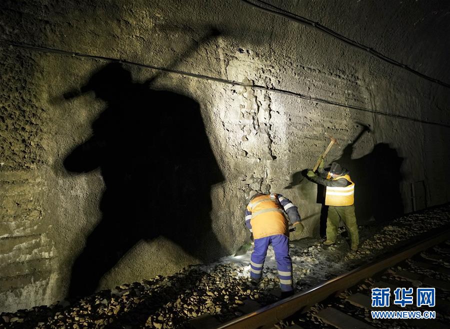 1月6日,在加格達(dá)奇工務(wù)段西羅奇嶺二號(hào)隧道,西羅奇維修工隊(duì)工作人員進(jìn)行維修作業(yè)。新華社記者才揚(yáng)攝