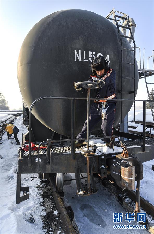 林海間的“送水小火車”調(diào)車員對(duì)“送水小火車”進(jìn)行出行前的檢查作業(yè)(1月17日攝)。新華社記者許暢攝