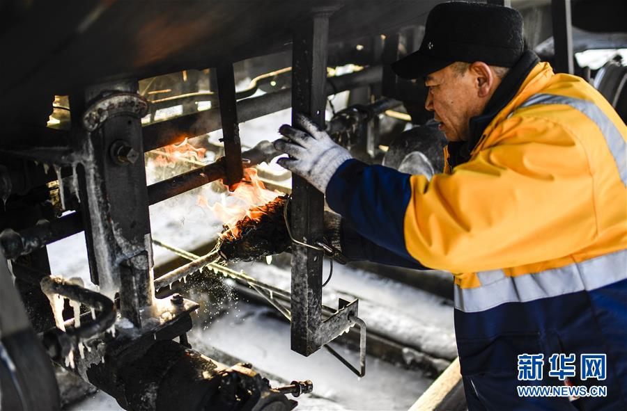 因?yàn)槎緶囟冗^低,送水員黃衛(wèi)東在蓄水前需要提前加熱閥門(1月17日攝)。新華社記者許暢攝