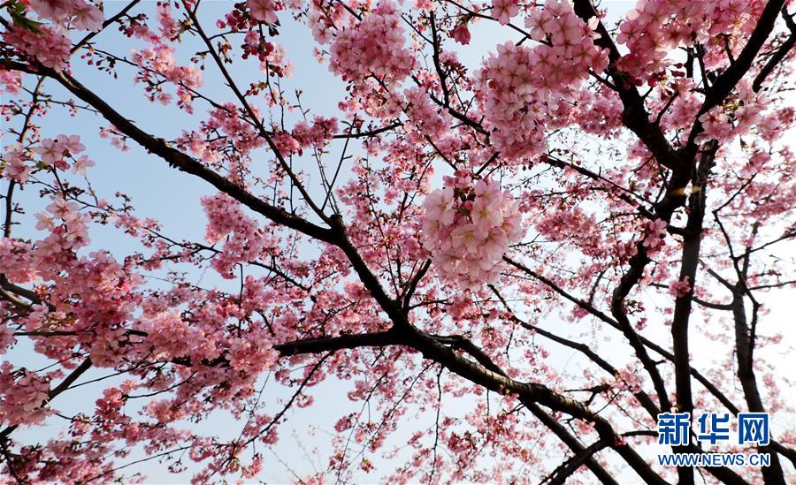 2月24日,蜜蜂在上海松江辰山植物園內(nèi)盛開(kāi)的河津櫻櫻花叢中飛舞。近日,上海松江區(qū)辰山植物園內(nèi)的河津櫻絢麗綻放,花團(tuán)錦簇間一派盎然春意。 新華社記者 方喆 攝