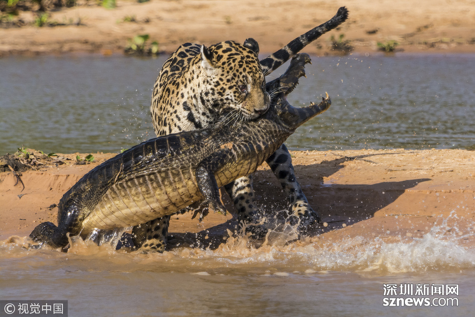 當(dāng)?shù)貢r間2013年8月25日,巴西潘特納爾,一頭雄性美洲豹攻擊了一條巴拉圭凱門鱷并與之纏斗。這只美洲豹預(yù)先躲在水中匍匐前進(jìn),然后突然出現(xiàn)把這只鱷魚震住,隨后用牙刺進(jìn)鱷魚的堅硬的外殼中,將其拖入?yún)擦帧?/p>