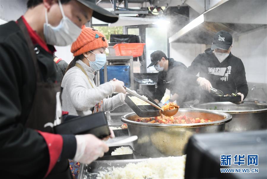 2月26日,劉女士(左二)和伙計(jì)們?cè)诜盅b盒飯。新華社記者程敏攝
