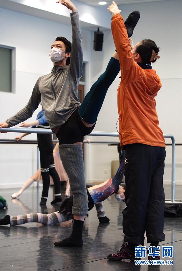 2月29日,在通過網絡直播的“公益公開課”上,上海芭蕾舞團團長辛麗麗(前右)在指導團員。新華社記者任瓏攝