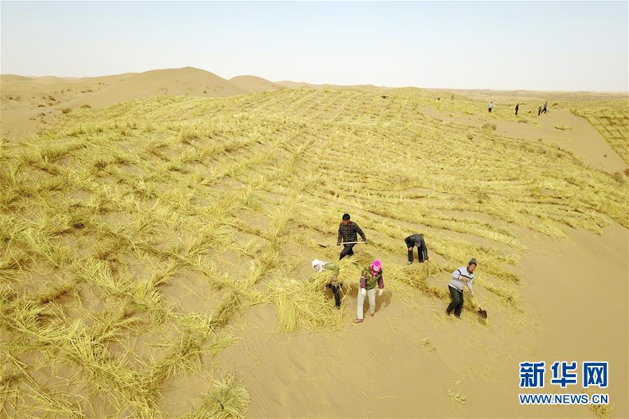 3月5日,在古浪縣北部沙區(qū)旱麻崗治沙點(diǎn),群眾扎草方格壓沙(無(wú)人機(jī)照片)。初春時(shí)節(jié),在騰格里沙漠南緣的甘肅省武威市古浪縣,當(dāng)?shù)馗刹柯毠ぜ鞍瞬缴沉謭?chǎng)治沙人共同在縣城北部沙區(qū)旱麻崗治沙點(diǎn)開(kāi)展春季治沙勞動(dòng)。新華社記者 范培珅 攝