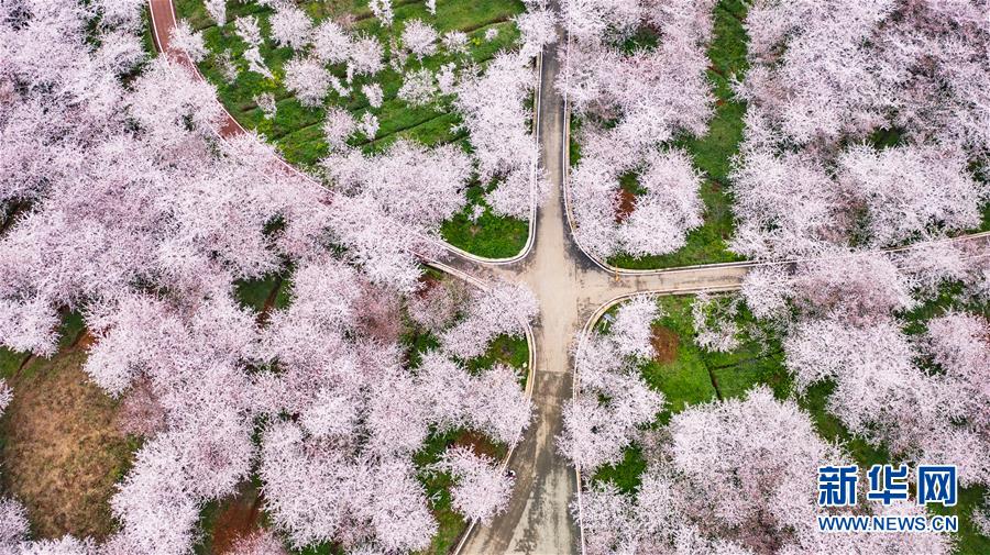 3月12日拍攝的貴安新區(qū)櫻花觀光園風景(無人機照片)。 近日,貴州省貴安新區(qū)櫻花觀光園內(nèi)櫻花競相盛開,花團錦簇間春意盎然。據(jù)介紹,疫情防控期間,為避免人群聚集,櫻花園暫不接待游客。 新華社記者 陶亮 攝