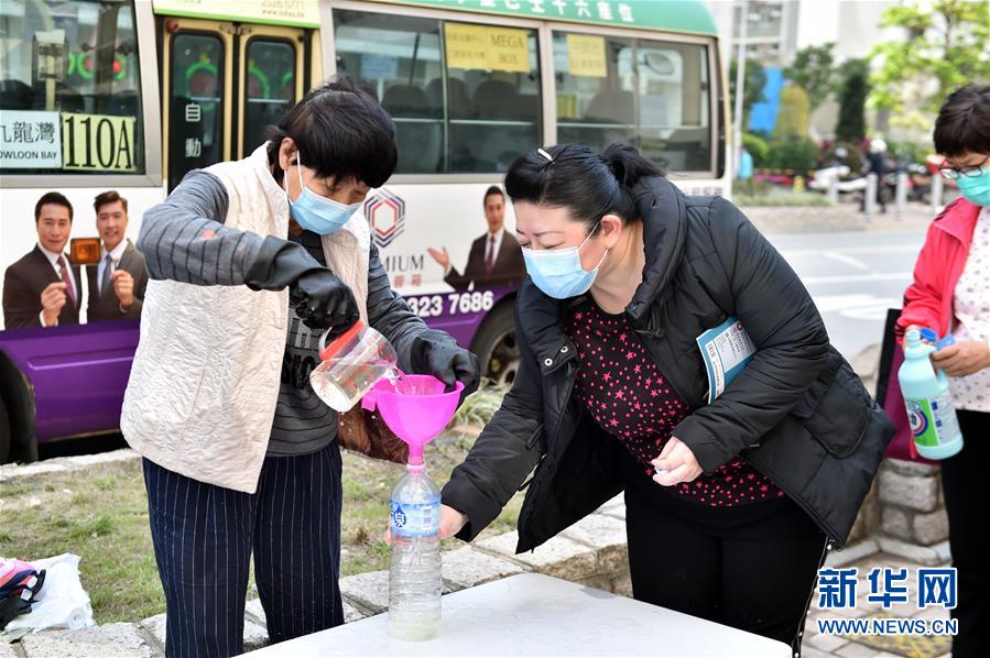 2月23日,市民領(lǐng)取消毒清潔劑。在將軍澳向市民免費派發(fā)消毒清潔劑。當(dāng)日,香港工聯(lián)會新華社記者盧炳輝攝