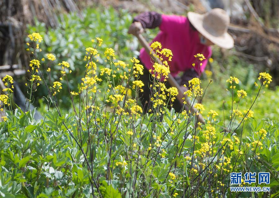 3月14日,在武漢市西北部市郊,一名市民在油菜花田間勞作。隨著氣溫升高,春意在武漢的枝頭上萌動,花朵漸次開放。新華社記者肖藝九攝