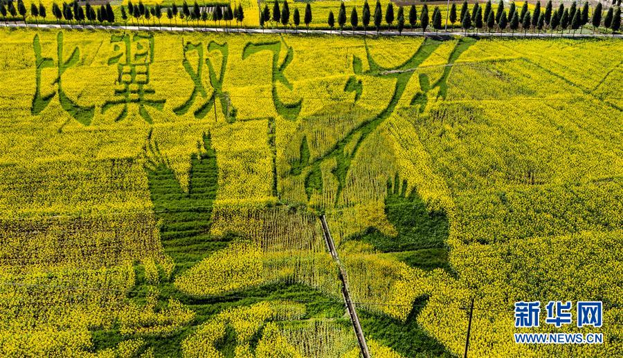 3月14日拍攝的洋縣洋州街道貫溪村創(chuàng)意種植的“比翼雙飛”油菜花景觀(無人機(jī)照片)。新華社記者陶明攝