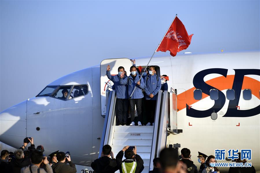 3月17日,醫(yī)療隊(duì)隊(duì)員抵達(dá)山東濟(jì)南遙墻國(guó)際機(jī)場(chǎng)。新華社發(fā)(饒琦攝)