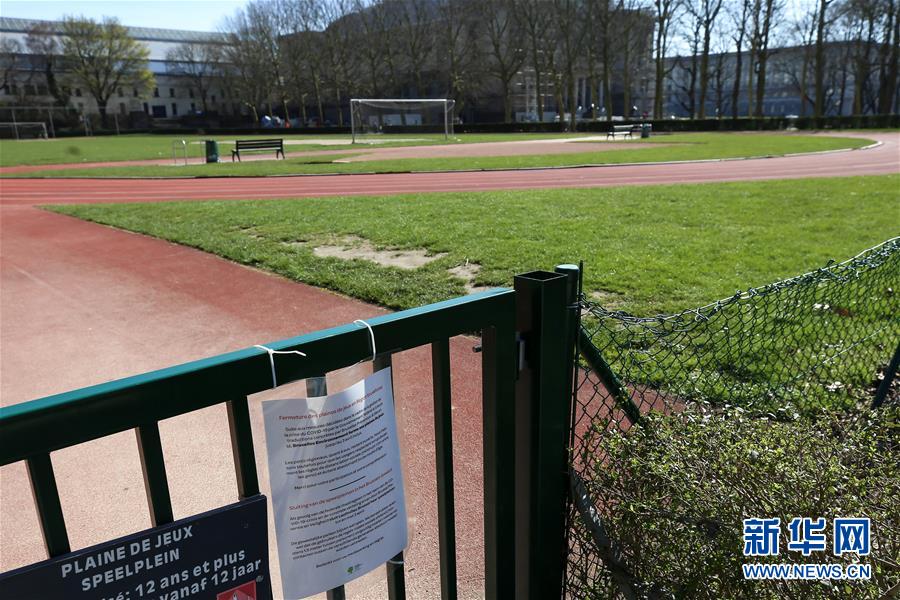 這是3月18日在比利時布魯塞爾拍攝的一處關(guān)閉的運(yùn)動場。 新華社記者 張鋮 攝