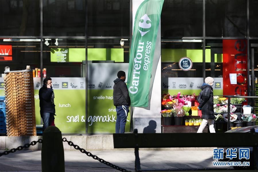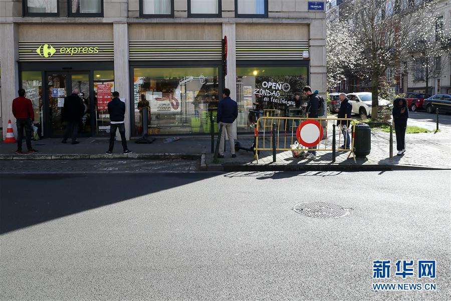 3月18日,在比利時布魯塞爾,顧客排隊等待進(jìn)入超市購物。 新華社記者 張鋮 攝